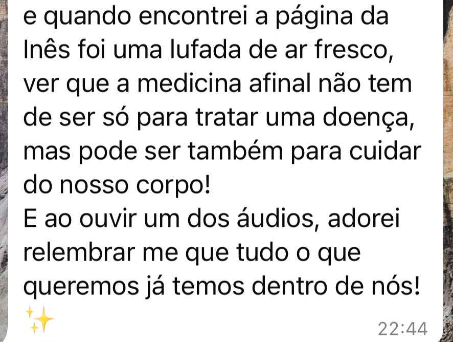 Por isso, a minha abordagem não é apagar sintomas, mas aprender com eles e expandir a tua saúde para sustentar a vida que desejas viver.