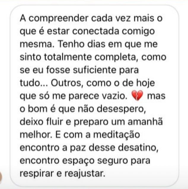 Procuramos as respostas fora quando, na verdade, já está tudo dentro de nós. Mas só precisamos de aprendar a escutar. E isso é Meditar. Estar e observar o que já está dentro.